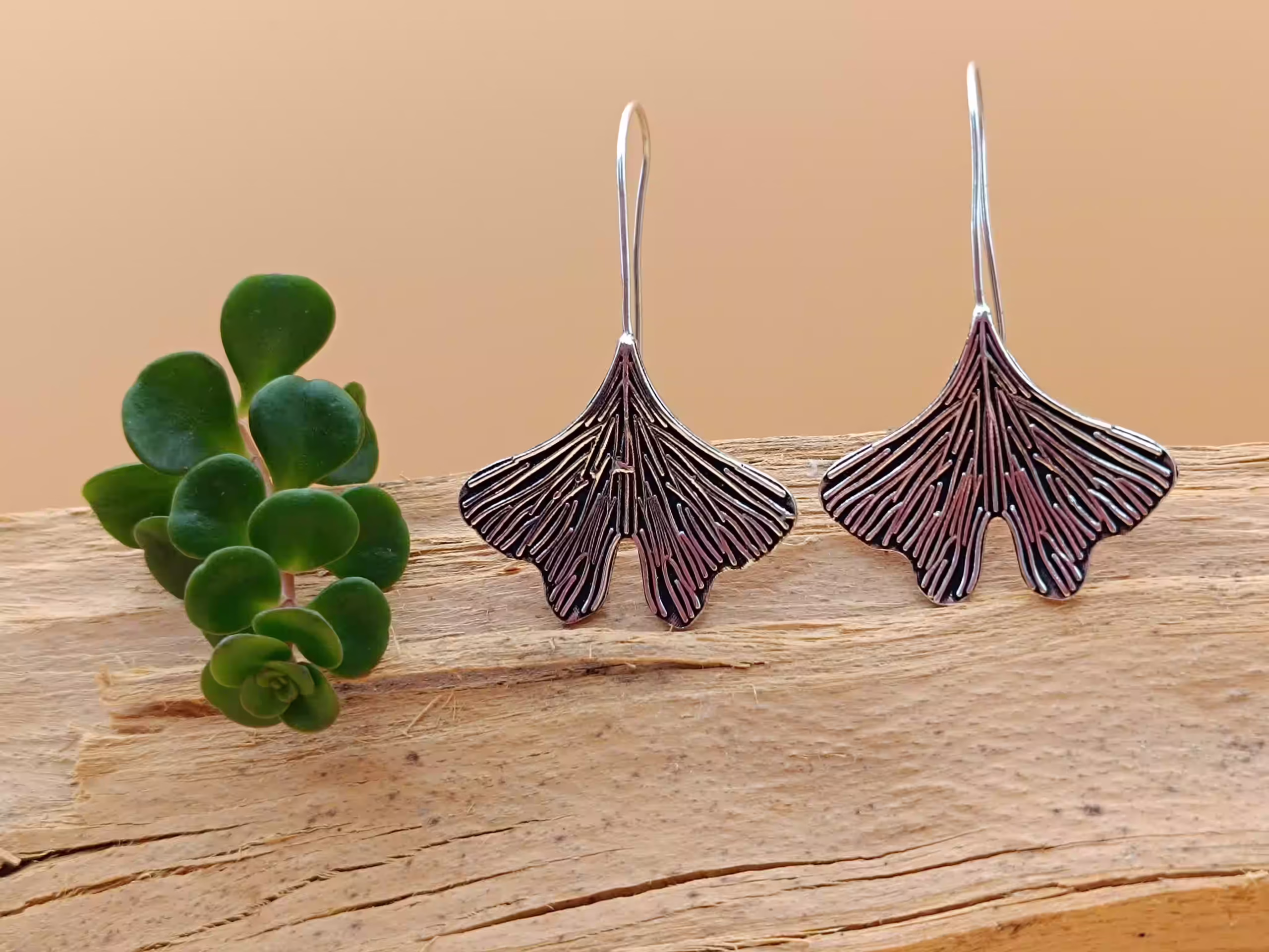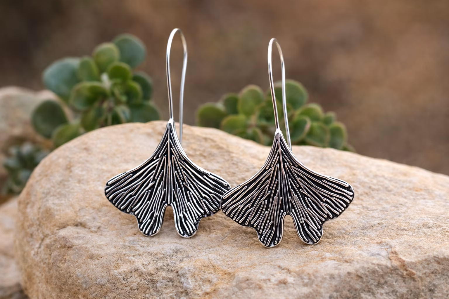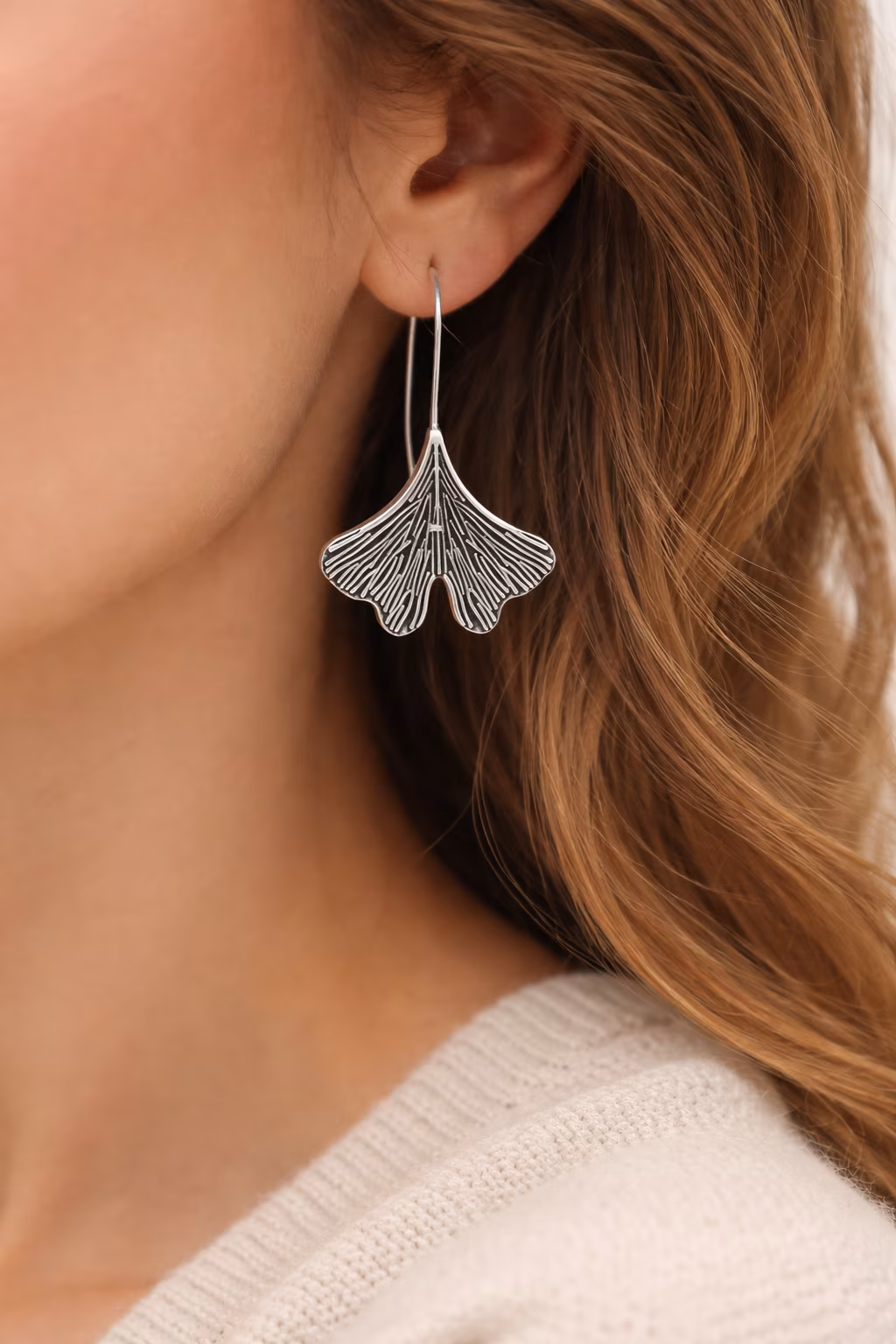 Ces boucles d’oreilles Ginkgo Sünya célèbrent la féminité résiliente. Elles s’inspirent des parures anciennes et du symbolisme profond de l’arbre millénaire. Les nervures délicates de la feuille sont méticuleusement sculptées dans le laiton argenté. Une patine sombre souligne chaque détail, créant un contraste captivant.